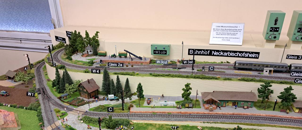 Das kleine Räumchen, von dem ich sprach, hat so etwas wie eine Lehrmodellbahnanlage im Maßstab H0 aufgebaut. Mehrere Bahnhöfe und ein- wie ausgehende Strecken von und nach im Fränkischen und Badischen (Neckarbischofsheim kam 1806 an das Großherzogtum Baden) bekannten Destinationen sind darauf zu finden. Nicht die großen Bahnhöfe, mehr die kleinen mit den langen Namen, manchmal auch Doppelnamen. Wer die Bahn öfter benutzt, wird sie kennen. Meist fährt man gedankenlos durch diese Bahnhöfe hindurch, denkt sich nicht viel dabei – ist ja nur so’n kleiner Bahnhof außerhalb. Doch für das Personal eines Stellwerks ist das eine feste Größe in ihrem Alltag. Jede Weiche muss gehorchen und will gestellt werden, ist der Bahnhof auch noch so winzig und klingt der Name noch so verwunschen.
