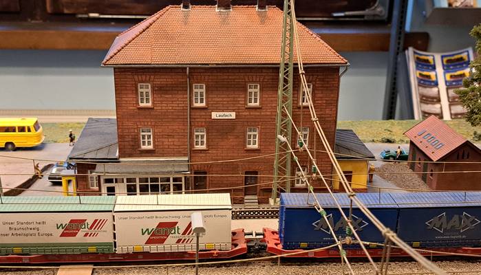 Ja, er ist schon ein Blickfänger. Alleine schon wegen seiner Länge. Wenn man im Vereinsheim der Eisenbahnfreunde an der Modellbahnanlage der „Spessartrampe“ entlanggeht, dann bleibt man unweigerlich am Bahnhof Laufach stehen. Das Auge hat aber auch ständig und an allen Stellen reichlich Naschwerk vor sich. Da widerstrebt es auch, schnell vorbei zu rauschen. Und das will ich heute auch tun, nämlich das Verweilen. Und ich will euch heute den Bahnhof Laufach etwas näherbringen.