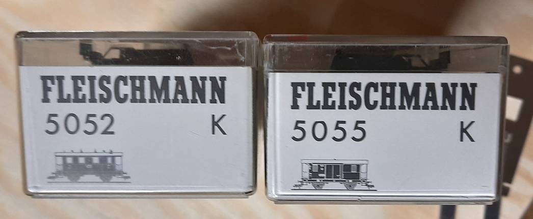 Die beiden neuen Fleischmann 5056 zweiachsiger Personenwagen 2. Klasse „AROSA“ – just so, wie ich sie in der Bucht geschossen habe.