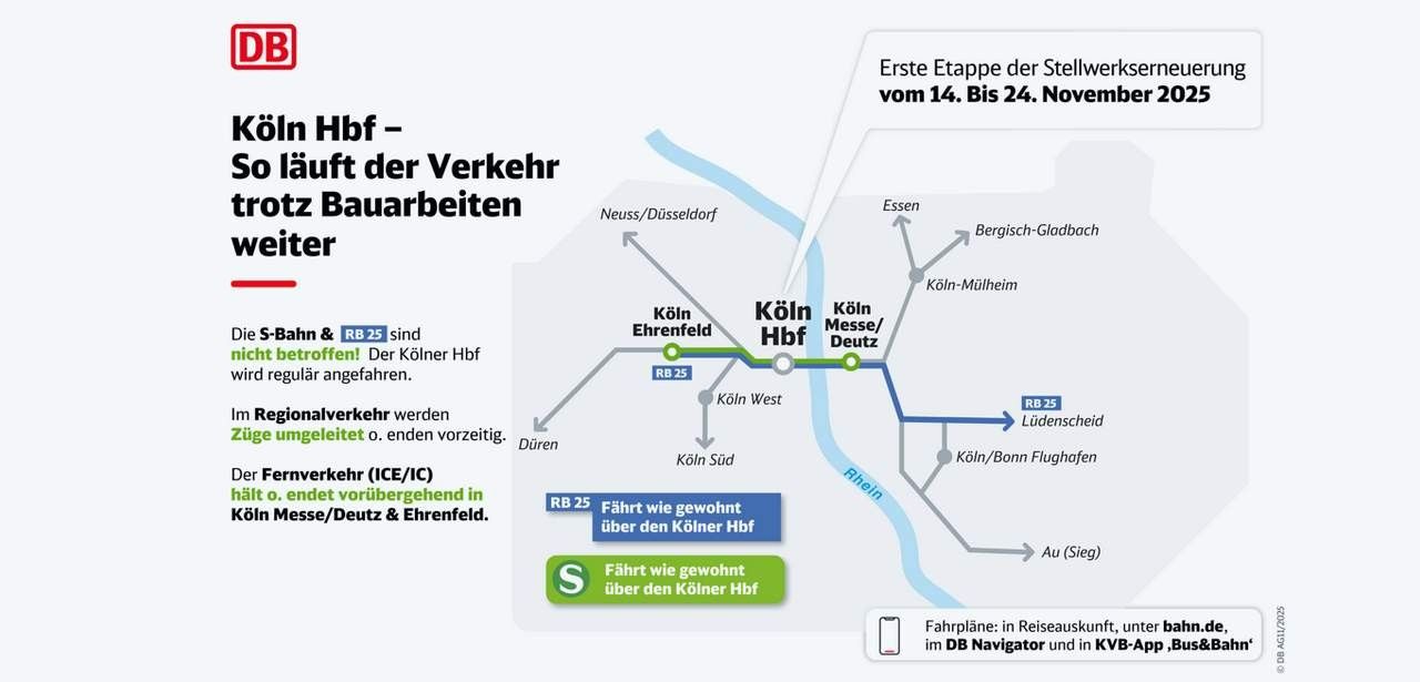 In der Zeit der Bauarbeiten ist der S-Bahnverkehr am Kölner Hauptbahnhof uneingeschränkt verfügbar, ebenso die Linie RB25. Im Gegenzug wird der übrige Regional- und Fernverkehr über alternative Strecken umgeleitet oder endet provisorisch an den Bahnhöfen Köln Messe/Deutz und Ehrenfeld. Reisende finden sämtliche Ersatzfahrpläne und Abfahrtszeiten in Echtzeit in der DB Navigator-App, auf bahn.de sowie in der KVB-App Bus&Bahn. Pünktlichkeitsempfehlungen und Hinweistext beachten. Aktuelle Lageinformationen und tarifliche Änderungen werden fortlaufend bereitgestellt.