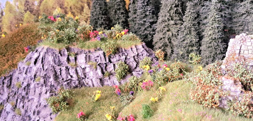 Viele sind stolz auf ihre Felsen, die sie mit Gips oder anderem Material sehr realistisch gestaltet haben. Wurden diese mit Grau grundiert, mit einem dunklen Wash überzogen, haben sie bereits ein sehr realistisch wirkendes Farbkleid. Wer dann noch die Kanten der Steine und Felsen mit Weiß trockenbürstet (Neudeutsch: graniert), der könnte sich bereits zufrieden zurücklehnen.