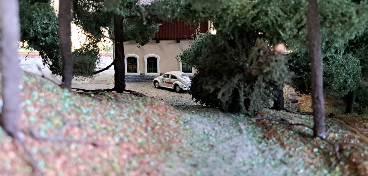Soll man den Betrachter unerwartet etwas entdecken lassen? Ich finde „Ja!“. Hier bietet sich ein Gebäude im Wald an, vor dem ein Pkw steht. Wer sich lange genug mit der Landschaft der Modelleisenbahn beschäftigt, wird belohnt.